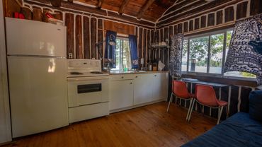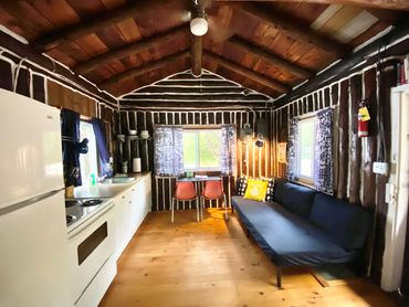 This original 1940s fishing cabin has beautiful vaulted ceilings and exposed log walls-this is one-of-a-kind experience. Located steps from the bay, Cedar has direct access to a beautiful sandy beach, the perfect spot for quiet reflection with your morning coffee. It features a queen bed and a sleeper sofa in the living area. This cabin includes a powder room, and is steps away from the Shower House, which shares access with the Birch and Jack Pine Cabins.