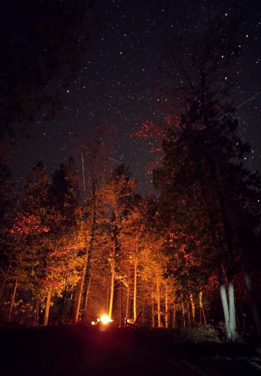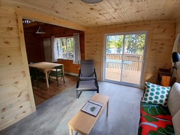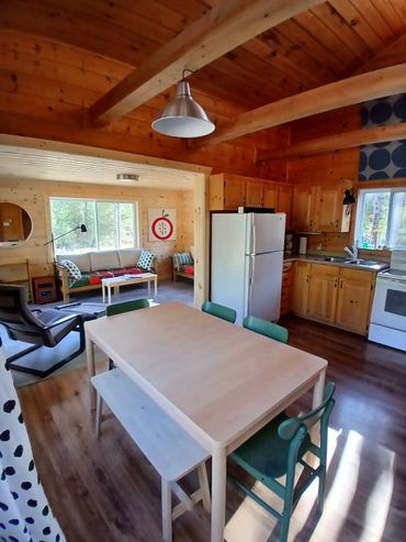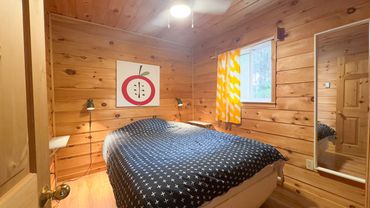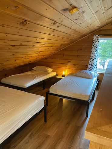 This cozy pine cabin is steps from the dock, making it perfect for anyone brave enough to begin the day with a cold plunge! It features a primary bedroom with a queen bed, and a loft with a queen and two single beds. As well, it includes a spacious sunlit living area with a fully equipped kitchen, and a spacious deck with seating and a barbeque. Guests of Juniper can enjoy their evenings by a private firepit with views of Mosque Lake by Moonlight.